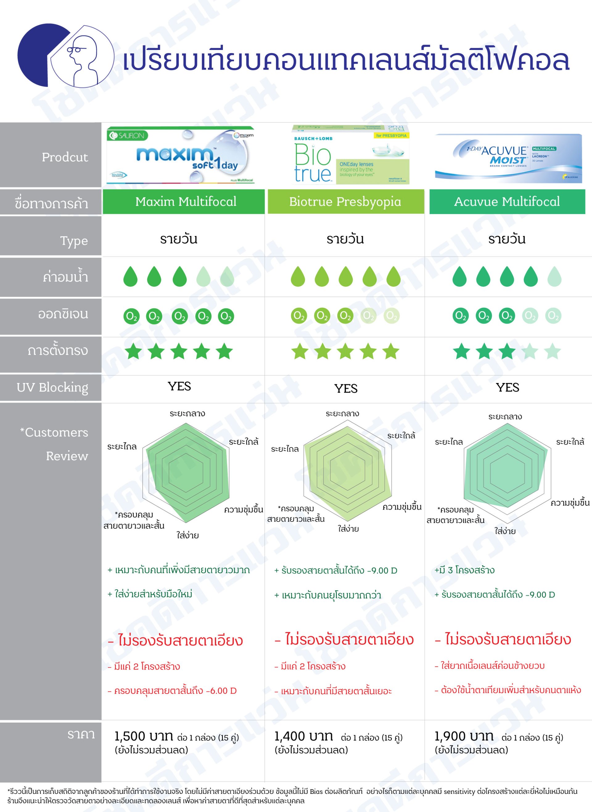 ในปัจจุบันคอนแทคเลนส์ Multifocal ในไทยมีให้เลือกเพียง 3 ค่ายเท่านั้น ซึ่งไม่สามารถแก้ไขภาวะสายตาเอียงได้